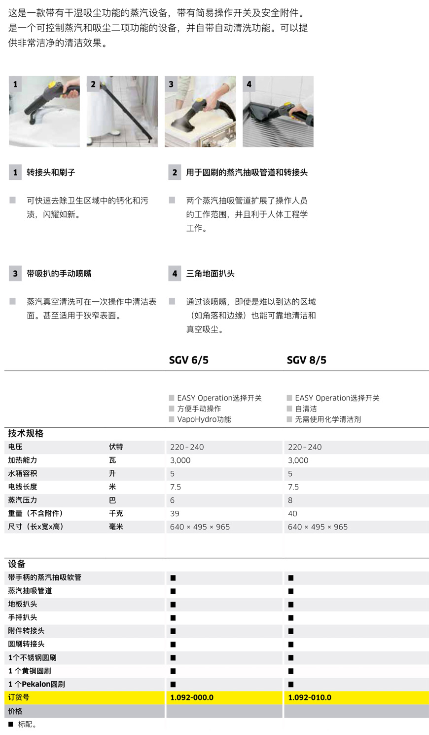 德國(guó)凱馳蒸汽真空清洗機(jī)SGV 6/5,蒸汽清洗和干濕吸塵二合一,蒸汽工作壓力:6 bar,水箱容量:5 l